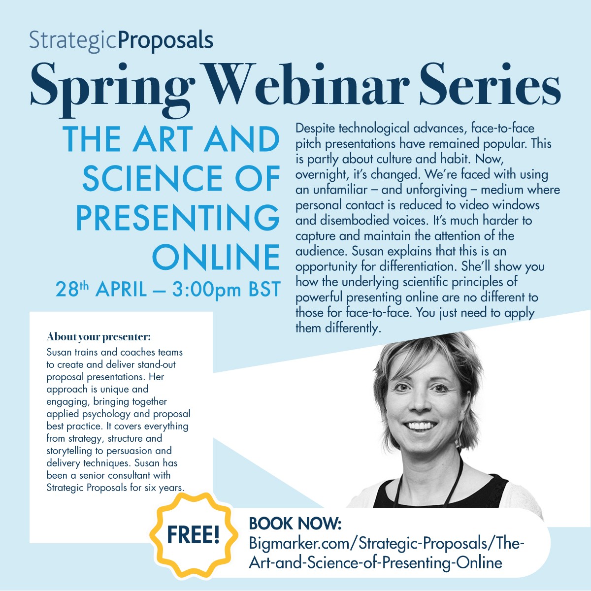 The pandemic created an overnight change in how presentations could be made. Overnight, we had to ditch face-to-face interactions and adapt to using an unfamiliar - and unforgiving – medium where personal contact was reduced to video windows and disembodied voices. Worse still, where it was much harder to capture and maintain the attention of the audience. Susan will explain how this is a huge opportunity for organisations to differentiate themselves and how the underlying scientific principles of powerful presenting online are no different to those for face-to-face. You just need to apply them differently.